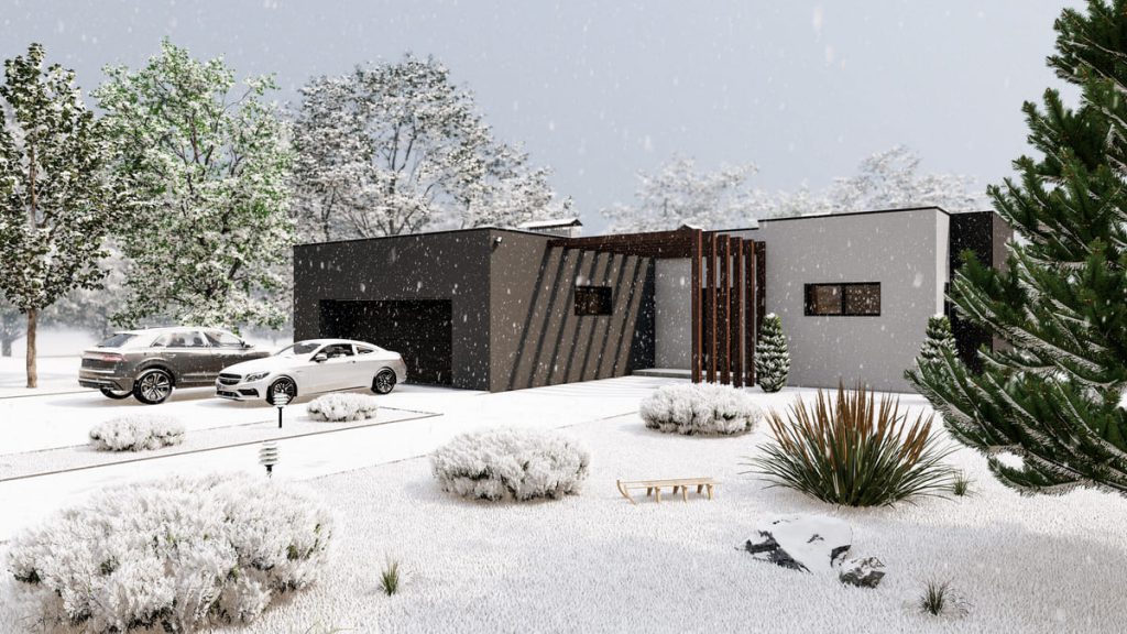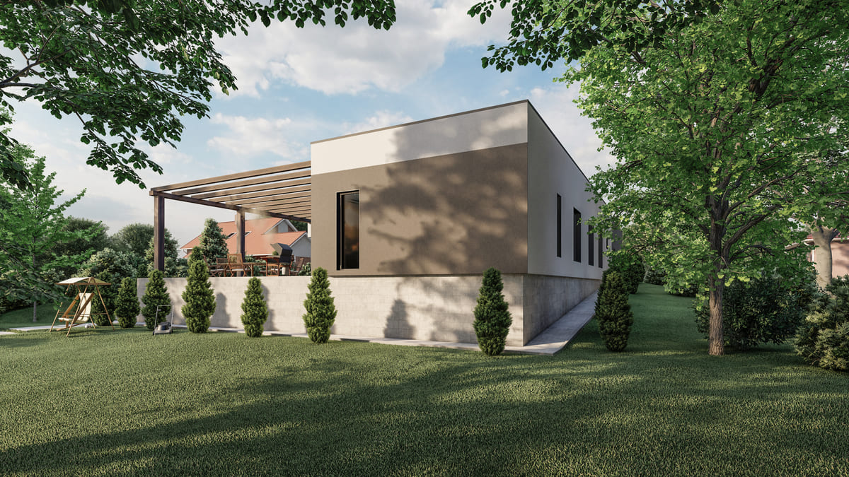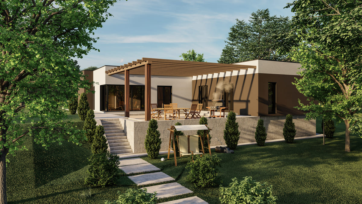 Evin planlaşdırma konfiqurasiyası geniş terrasla iç həyəti düzəltməyə imkan tanıyır. Bu, soyuq qış küləklərindən və ya yanan günəş şüalarından qorunmaq üçün rahat bir həll təqdim edir.